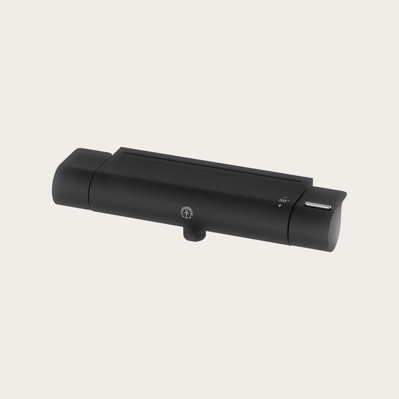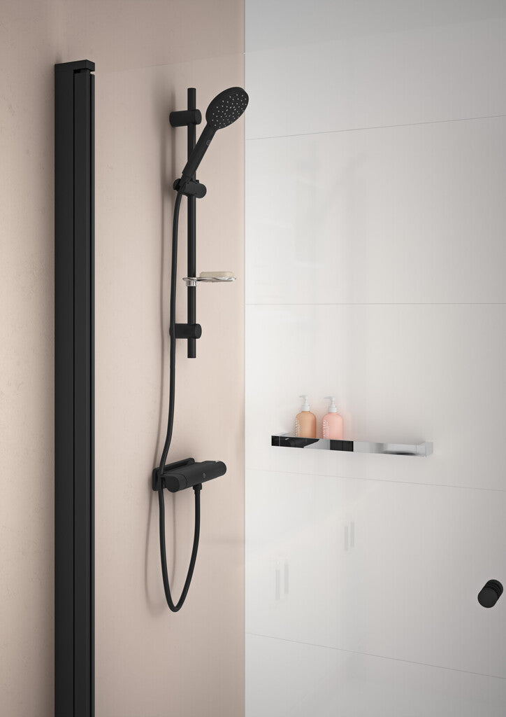 Den keramiska avstängningen ger lång livslängd, droppsäker funktion och enklare användning även för små eller svaga händer. Blandaren har dessutom typgodkända backventiler, återströmningsskydd enligt SS-EN 1717 och levereras med en smart avställningshylla – perfekt för schampo, tvål eller duschtillbehör.